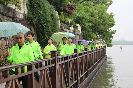 上午9點半,來自各單位的百余名職工齊聚在南湖會景園,盡管當(dāng)天天公不作美,淅淅瀝瀝下著雨,但大家熱情不減,風(fēng)雨無阻,一個個齊刷刷邁開步伐,精神飽滿地投入到環(huán)南湖健步走活動中。統(tǒng)一的著裝、鮮艷的旗幟,形成了一道道亮麗的風(fēng)景線,吸引了諸多市民的駐足觀望。