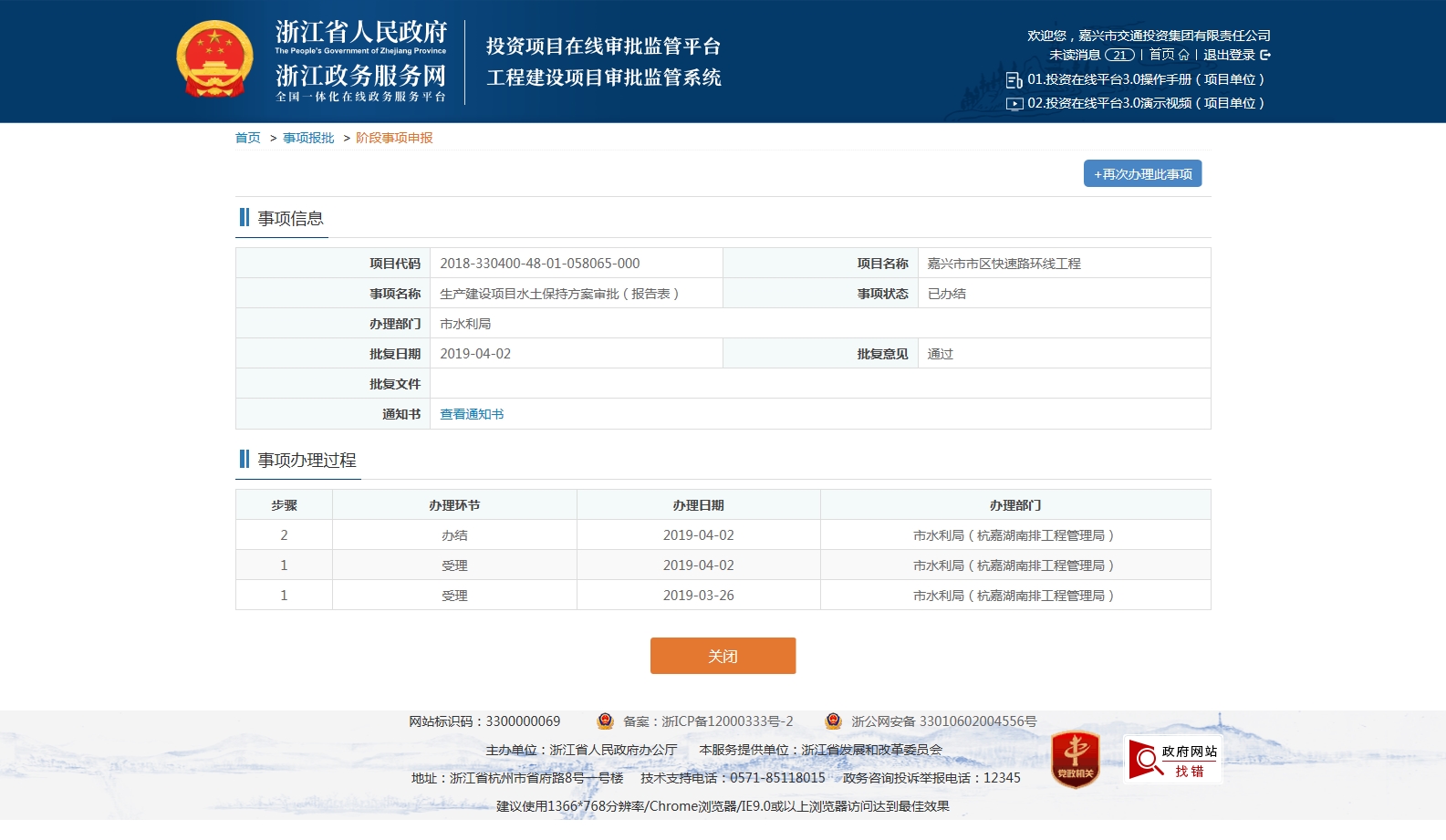 嘉興市市區(qū)快速路環(huán)線工程一期生產(chǎn)建設(shè)項目水土保持方案審批