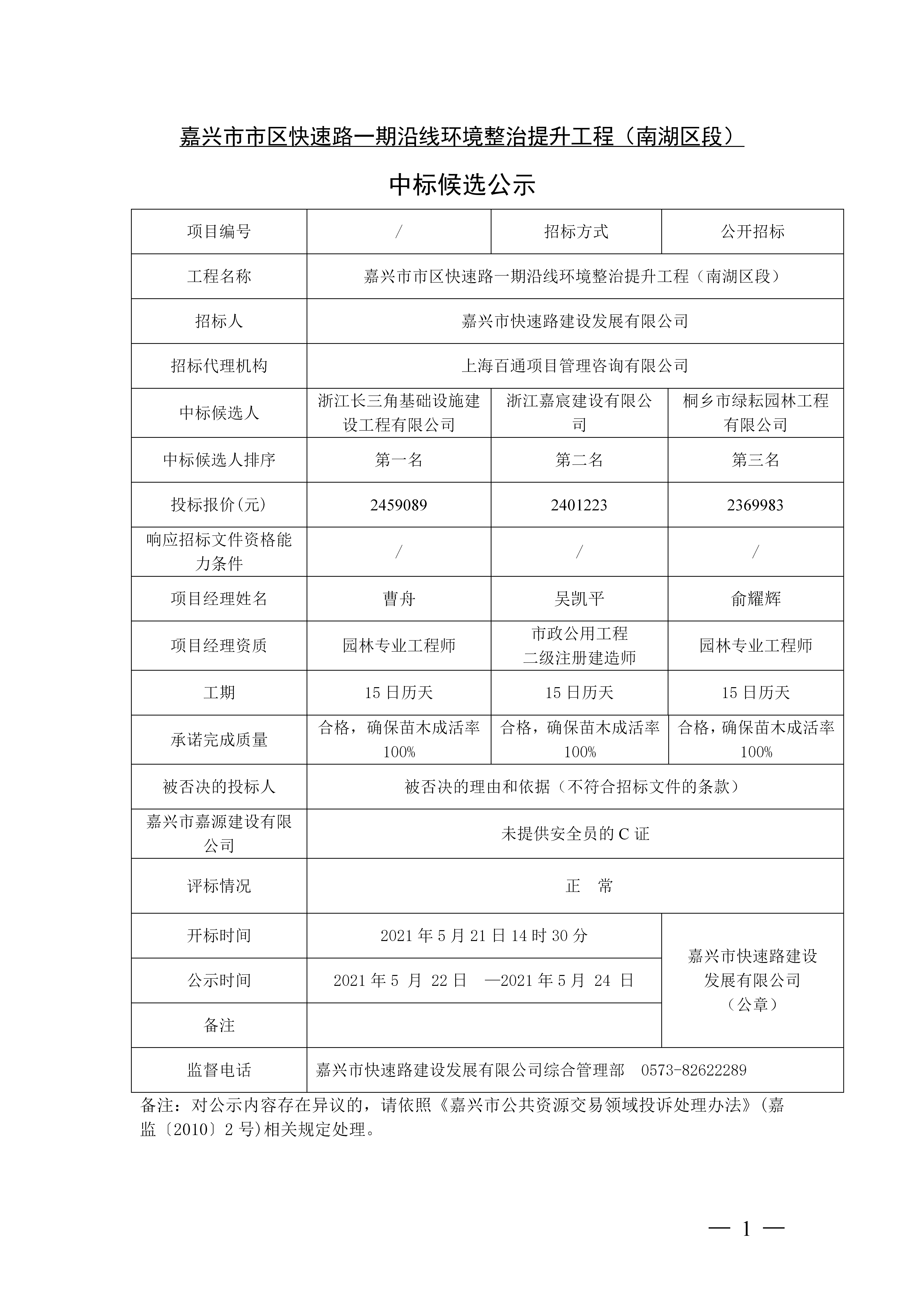 嘉興市市區(qū)快速路一期沿線環(huán)境整治提升工程(南湖區(qū)段) 中標候選公示
